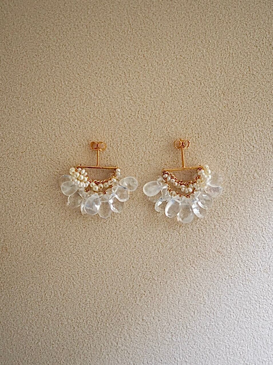 チェーンに編み込んだ、ちいさなパールの粒と、雫型のムーンストーンと水晶。光を閉じ込めながら優しく揺れます。それはまるで、雪のような美しいピアス。特別な日、また、デイリーでも身に付けて、少しリッチな耳元に心躍ります。